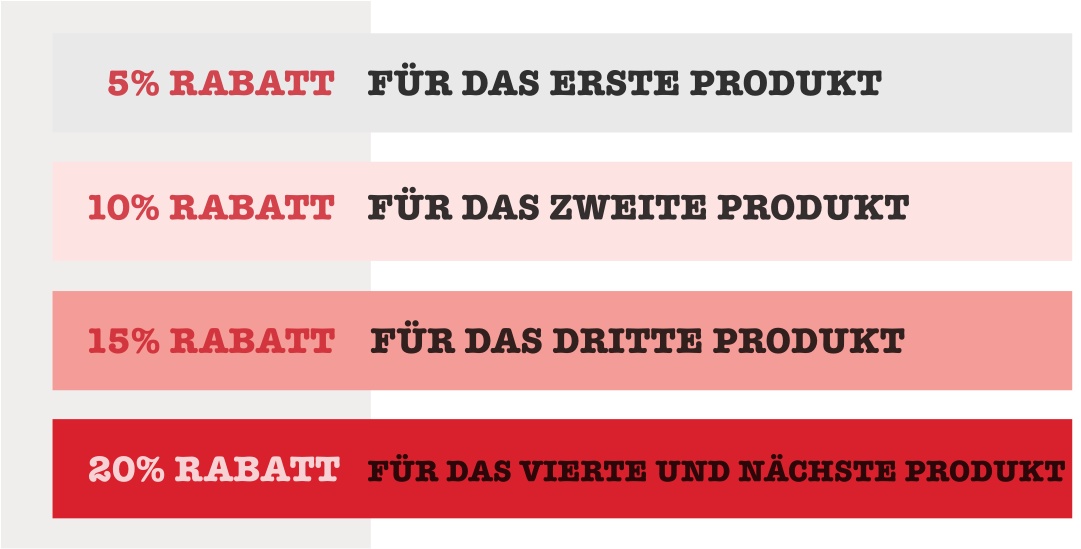 Beim gleichzeitigen Kauf mehrerer Produkte erhält jedes Produkt einen Rabatt!