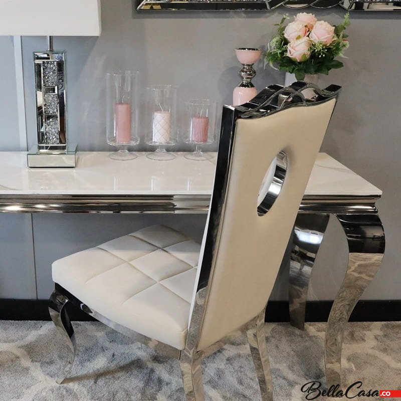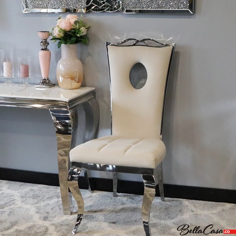 LUXURY Glamour-Stuhl ist ein absolut einzigartiges Möbelstück, das Luxus, Stil und Liebe zum kleinsten Detail vereint. Es ist ein wahres Juwel in der Welt der Innenarchitektur. Sein einzigartiges Design fällt sofort auf. Die beige Polsterung des Stuhls bildet einen Kontrast zum glänzenden silbernen Stahl und verleiht dem Stuhl eine einzigartige Ästhetik. Es ist ein Möbelstück, das Eleganz und Prestige ausstrahlt. Der Luxus-Glamour-Stuhl ist nicht nur ein Möbelstück. Es ist Ausdruck Ihres individuellen Stils und einzigartigen Geschmacks, der dem Raum außergewöhnliche Eleganz und Einzigartigkeit verleiht.