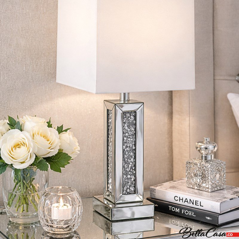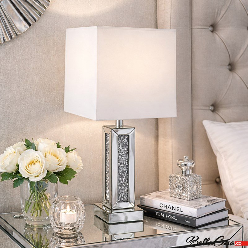 Das elegante Design der Lampe wird jeden Liebhaber des Glamour-Stils zu schätzen wissen. Schlicht im Erscheinungsbild, nach unten leicht verbreitert, streut der weiße, quadratische Lampenschirm das Licht angenehm. Der Spiegelfuß ist mit Glaskristallen verziert, die in Kombination dem Raum Glanz verleihen.