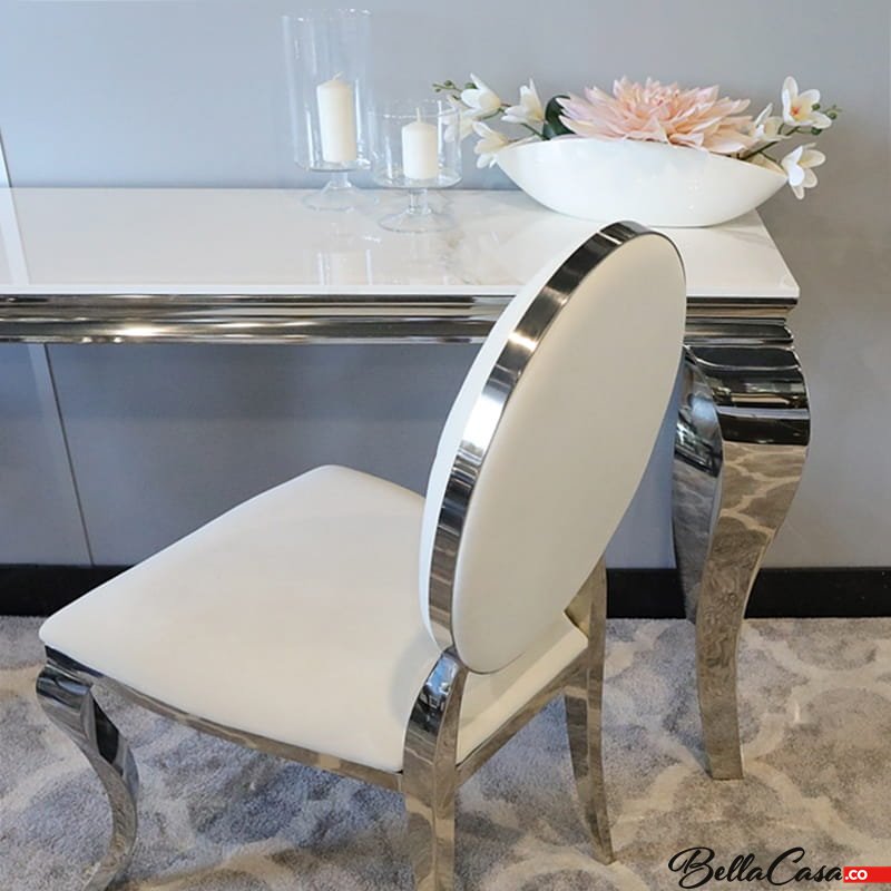 This is an unusual chair in its performance, it is an ideal proposition for our living room, dining room, office or bedroom. The chair is also perfect for an elegantly furnished restaurant or wedding hall. A beautiful silver chair frame fits perfectly with a velor upholstery on the seat, as well as the based, creating a noteworthy proposal to use at the glamor table. The charming design of this chair goes perfectly with various interior arrangements, giving them a special charm. His noble steel polished with splendor catches the eye and gives the room an exclusive character.