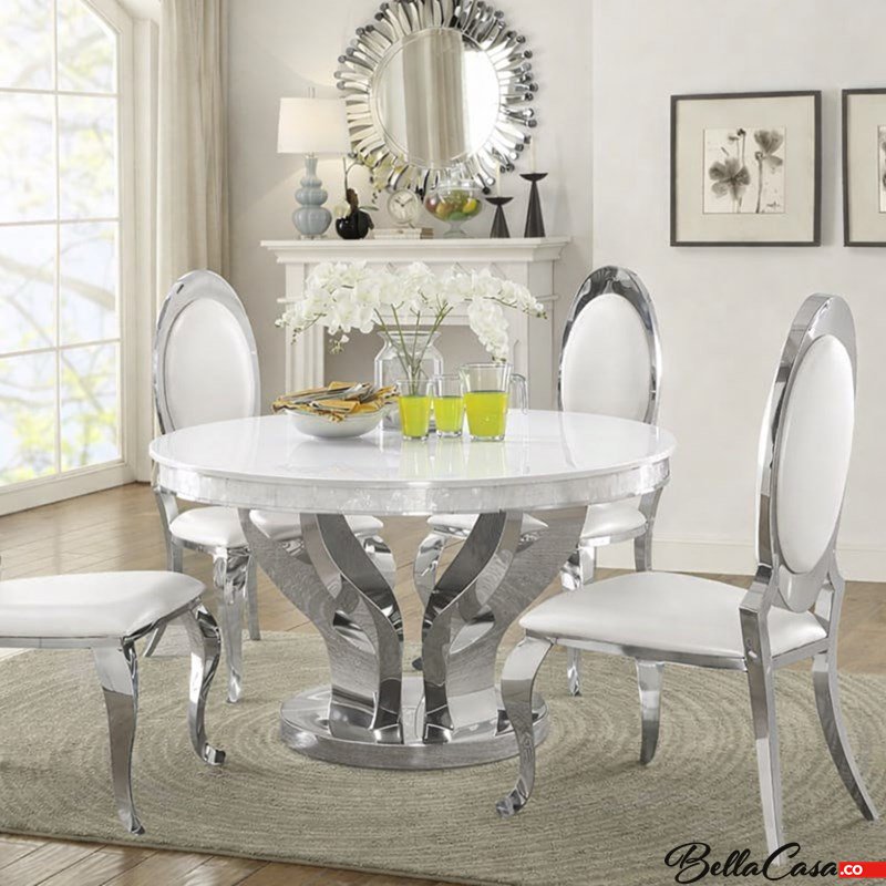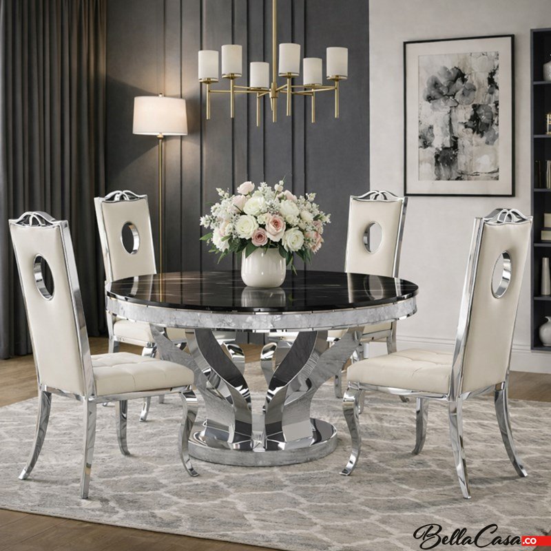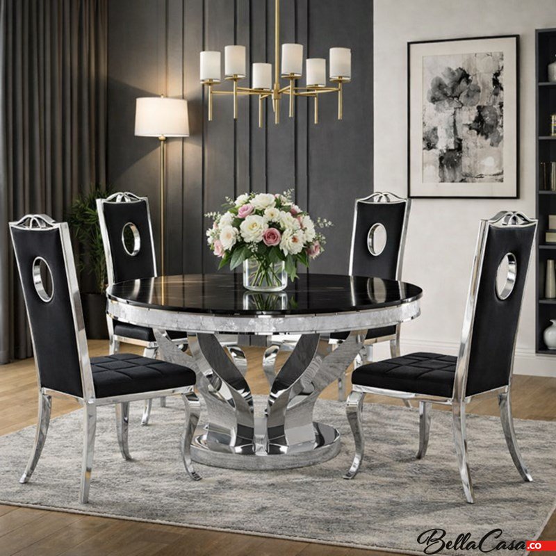 Round dining table in the glamor style, made of polished stainless steel in silver. Distinguished by a beautiful, high gloss glamor table, it has a stone top in a color of your choice.