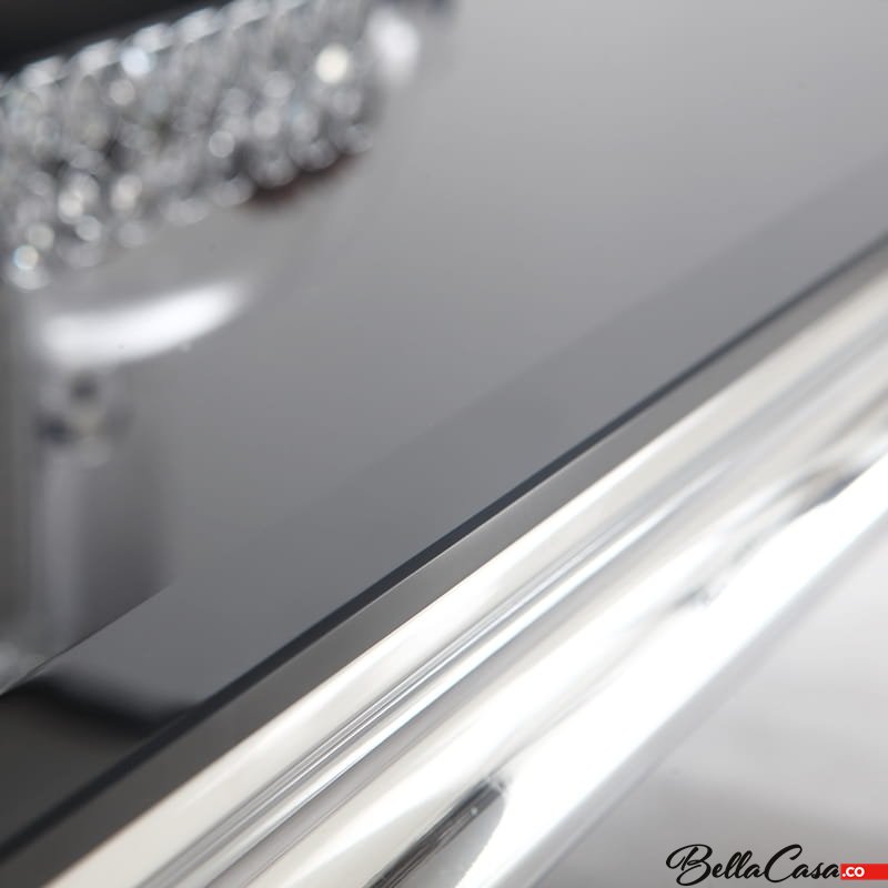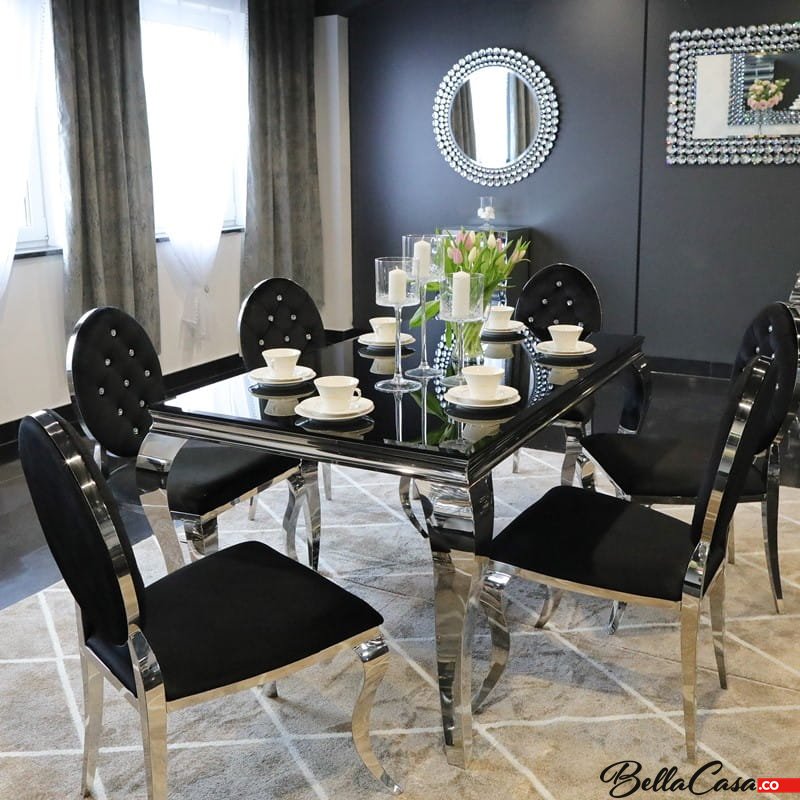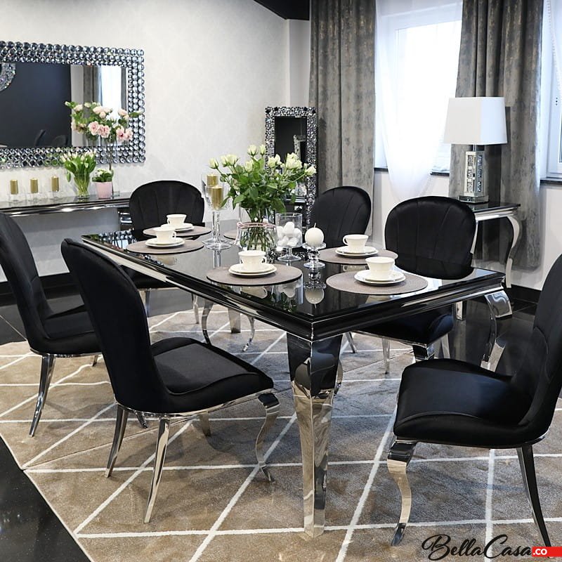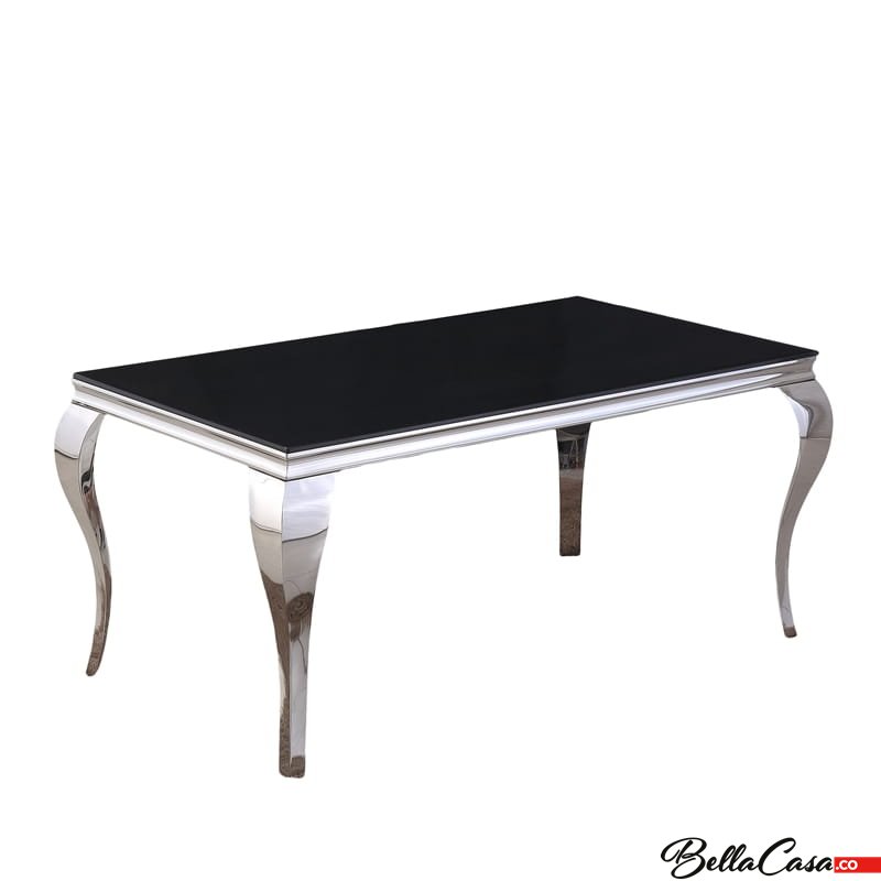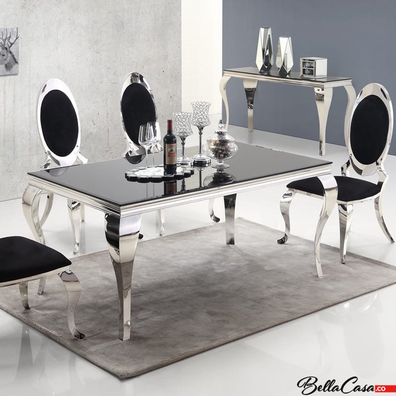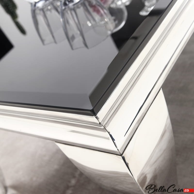 Ludwik glamor table 200x100 cm, made of polished stainless steel with a black glass top.