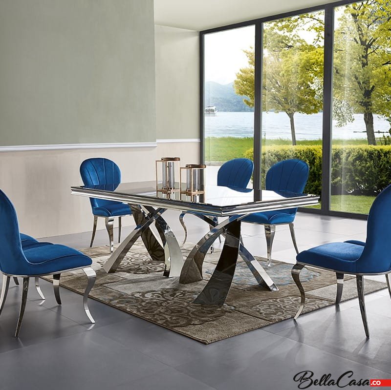 Lincoln glamor table 200x97 cm, made of polished stainless steel with a black glass top.
