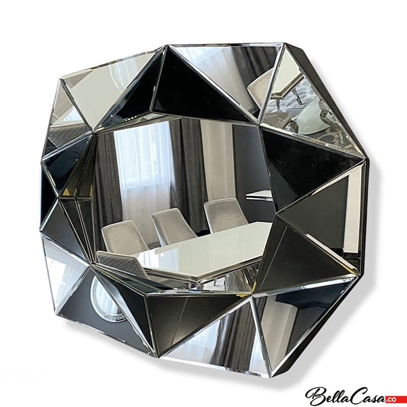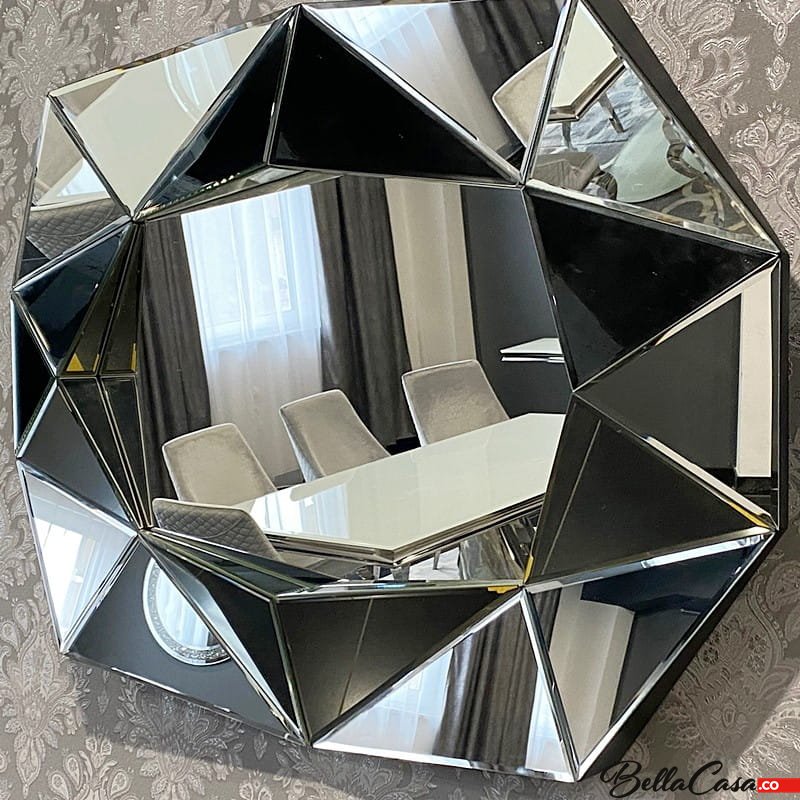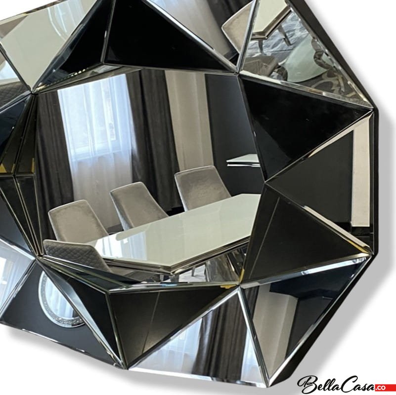 The mirror impresses with its original shape, thanks to which it will be an effective decorative element of the living room, bedroom or hall. There are polished fragments around the mirror that resemble the surface of a shiny diamond. The combination of a mirror with triangular, almost crystal elements creates an extremely elegant atmosphere in any room. No matter where you hang them, it always looks special! The mirror is distinguished by a unique, sophisticated and extraordinary design. It captivates with its effectiveness, charm, brilliance and splendid form. The mirror in this series is unique and unrepeatable. It will be an extraordinary decoration in your home.