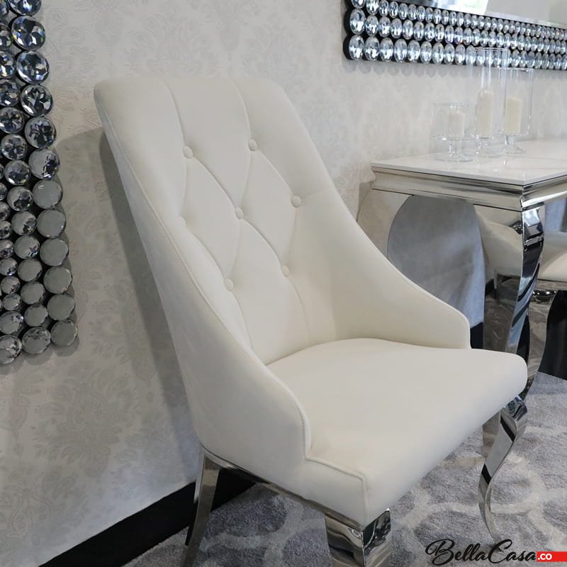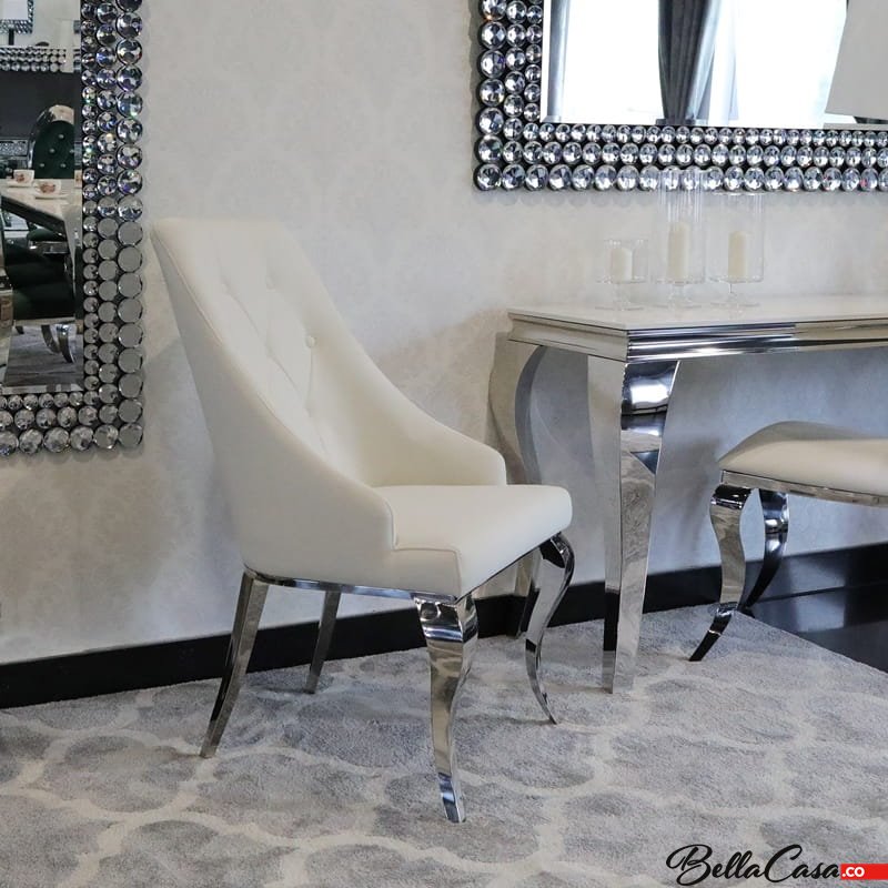 Exclusive William II glamour chair, made of polished silver stainless steel, covered with white (ecru) velvet.