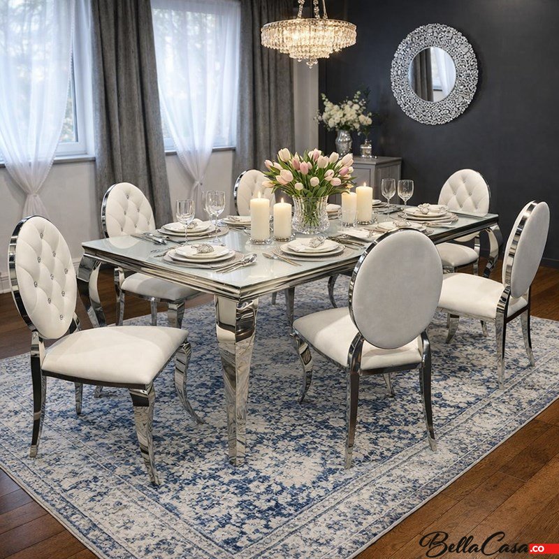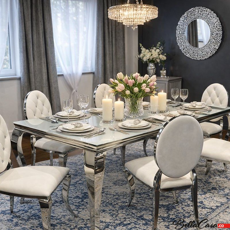 Dieses einzigartige Esszimmer passt perfekt zu den eleganten Accessoires im Glamour-Stil, wie zum Beispiel Glamour-Spiegeln. Es lohnt sich auch, darüber nachzudenken, unser Wohnzimmer mit einem schönen Couchtisch, Tisch oder einer Konsole aus der gleichen Möbelkollektion, der Ludwik-Kollektion, zu ergänzen.