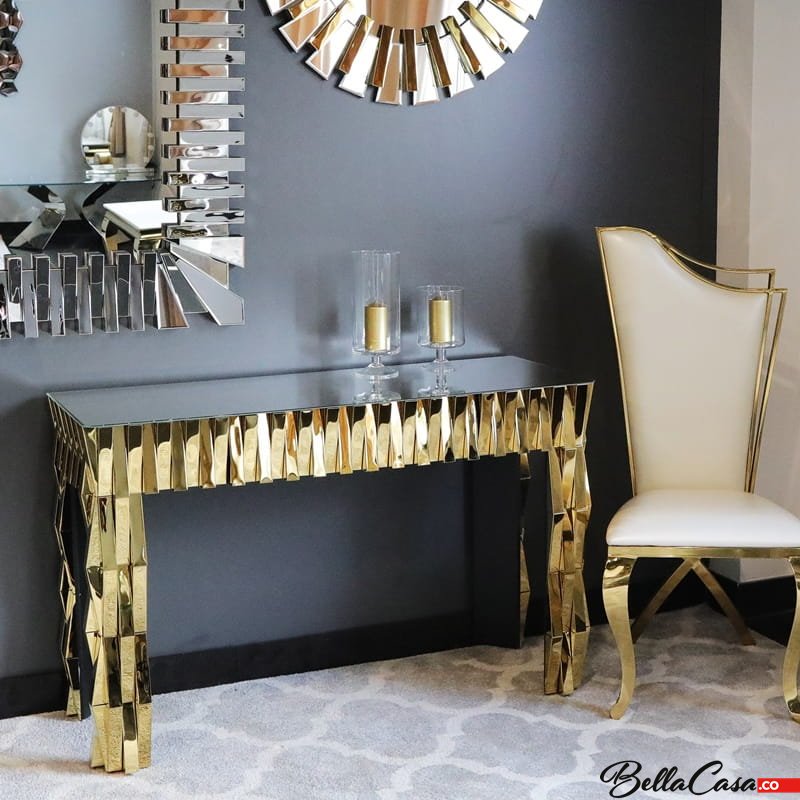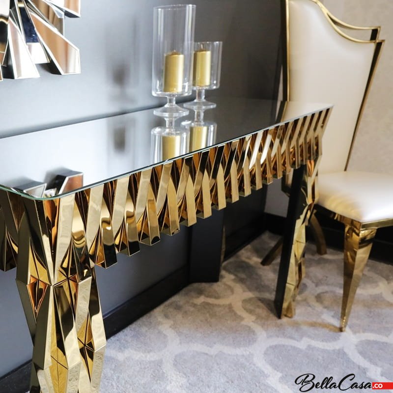 Ekskluzywna konsola glamour ze złotą podstawą i szklanym blatem – elegancki mebel do salonu lub przedpokoju