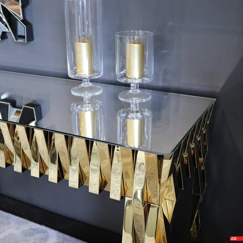 Wprowadź do swojego wnętrza odrobinę luksusu i elegancji dzięki konsoli glamour z wyjątkową złotą podstawą o geometrycznym wzorze. Ten mebel zachwyca nie tylko formą, ale również precyzyjnym wykonaniem, które czyni go idealnym wyborem do nowoczesnych aranżacji wnętrz w stylu glamour, art déco czy modern.