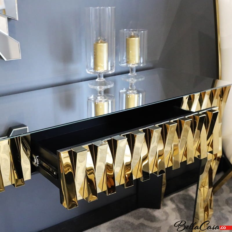 Szklany blat świetnie kontrastuje z dynamiczną, złotą konstrukcją, tworząc harmonijną całość, która przyciąga wzrok. Konsola sprawdzi się jako mebel do przedpokoju, salonu, sypialni, a także jako stylowy akcent w luksusowym butiku czy gabinecie.
