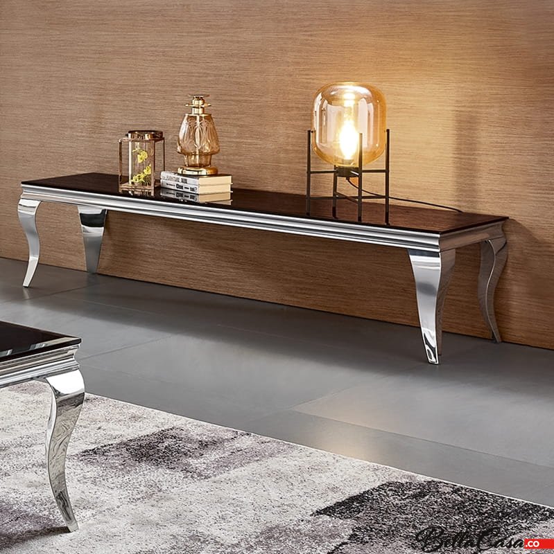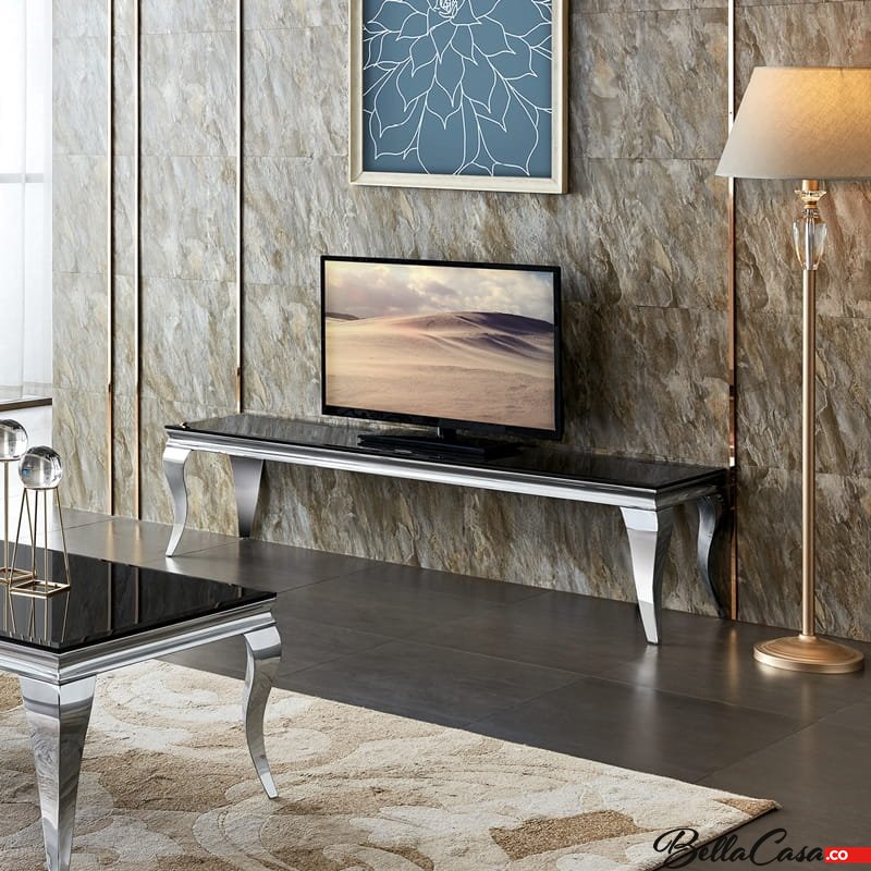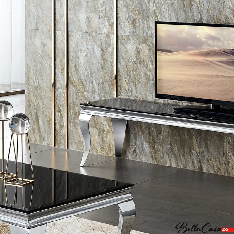 Stolik RTV glamour Ludwik, wykonany ze stali szlachetnej polerowanej w komplecie z blatem szklanym czarnym.