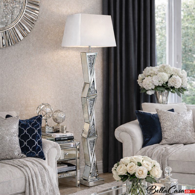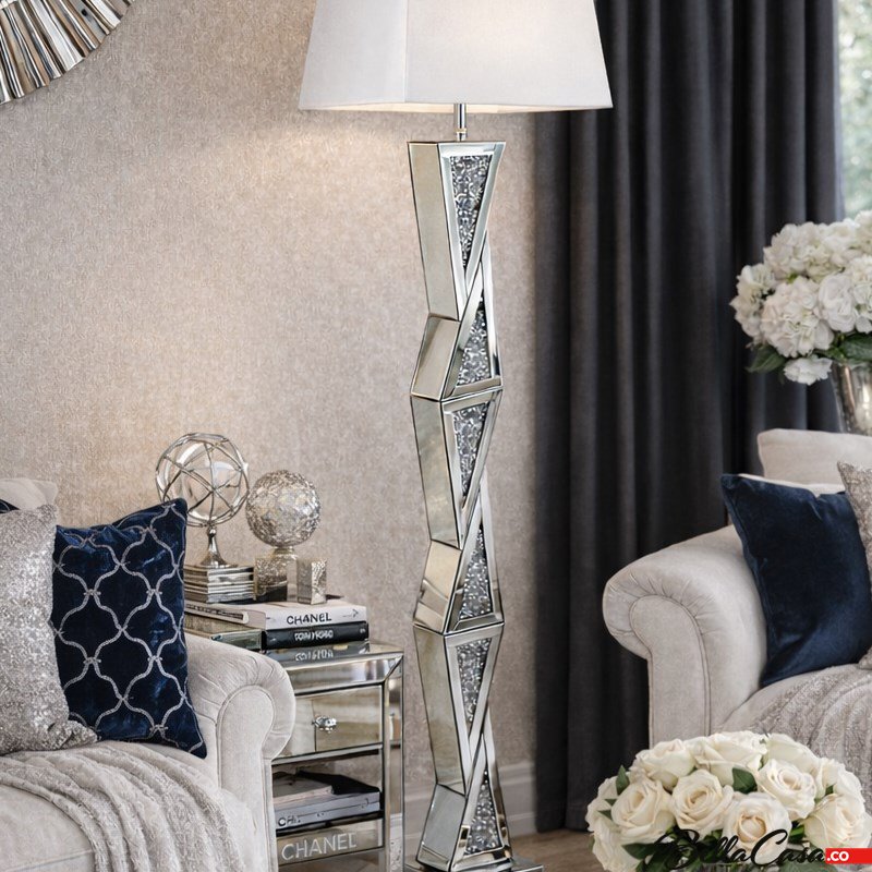 Lustrzana lampa stojąca w stylu glamour dekorowana kryształkami