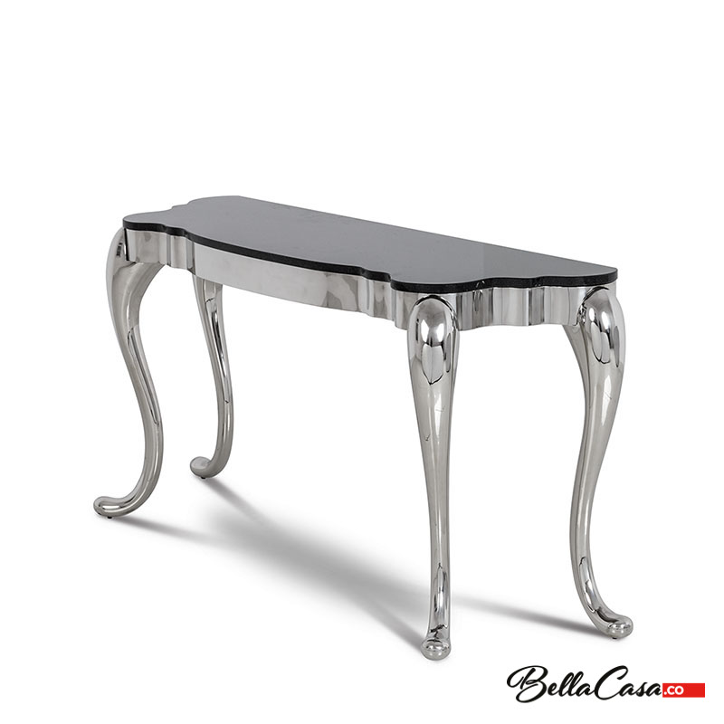 Niezwykle subtelne konsole glamour z kolekcji BellaCasa.co, posiadają szklane, bądź kamienne blaty. Kształt konsol przywołuje na myśl dworskie wnętrza.