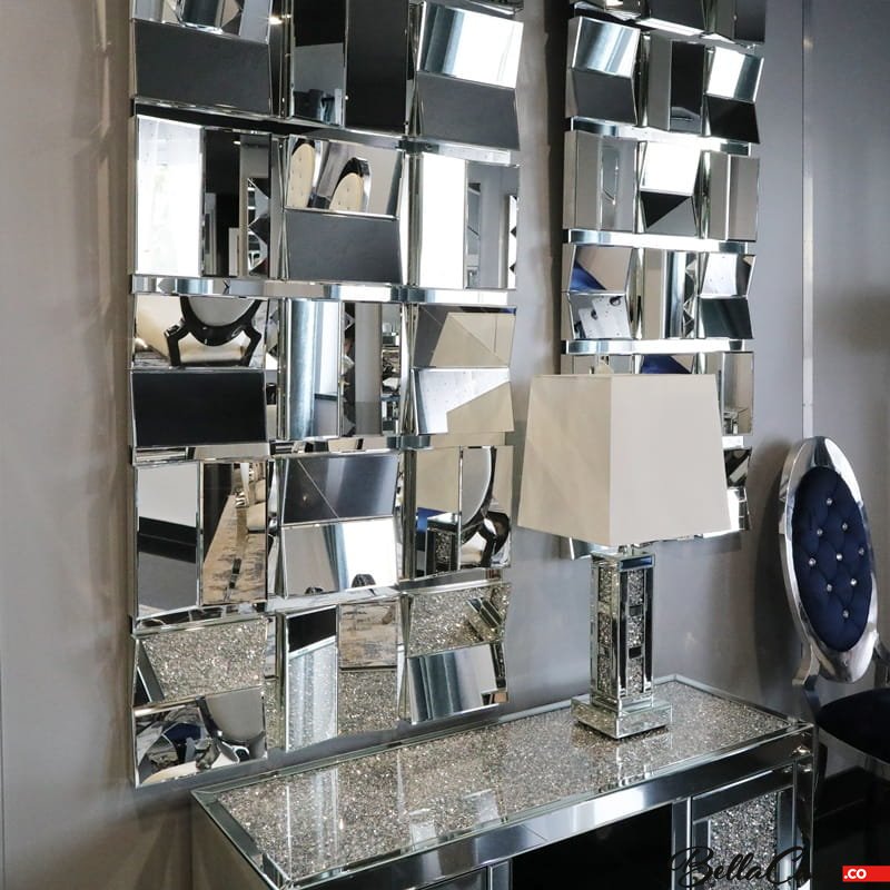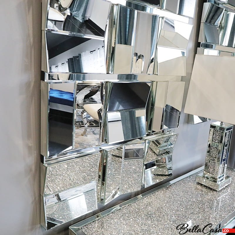 Lustro o trójwymiarowej płaszczyźnie. Kwadraty ustawione są pod różnym kątem, co daje niesamowity efekt odbijania i rozpraszania światła. Ta niebanalna dekoracja powiększy wnętrze, rozświetli je oraz nada mu wyjątkowy charakter.