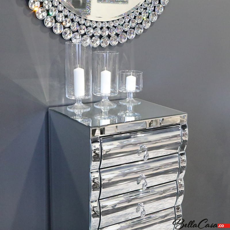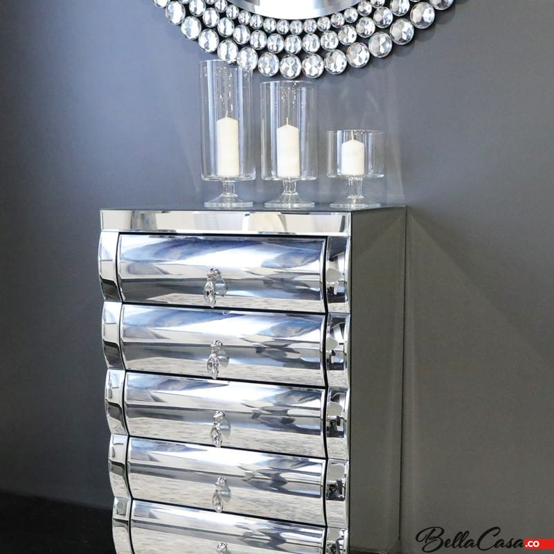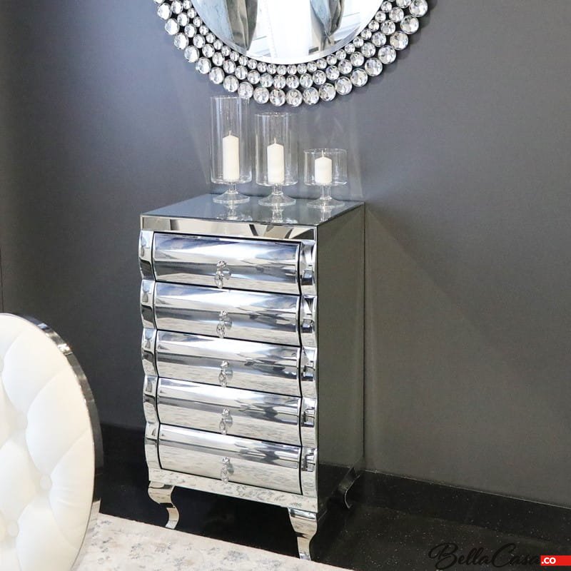 Lustrzana komoda Milano to mebel, który swoim niepowtarzalnym designem odmieni każde wnętrze, podkreślając jego niepowtarzalny charakter. Szczególnie sprawdzi się jako niezwykle gustowny i jednocześnie bardzo funkcjonalny dodatek do luksusowej sypialni, urządzonej w stylu glamour. Komoda Milano to prawdziwa definicja luksusu i elegancji. Mebel ten zwraca uwagę swoim niecodziennym wyglądem. Gięte nogi wykonane są z wysokiej jakości polerowanej stali nierdzewnej. Górna część szafki pokryta jest gładkimi lustrzanymi taflami szkła, które pięknie mienią się w świetle, tworząc niepowtarzalny i niezwykle przytulny klimat. Komoda posiada kilka szuflad z ozdobnymi uchwytami.