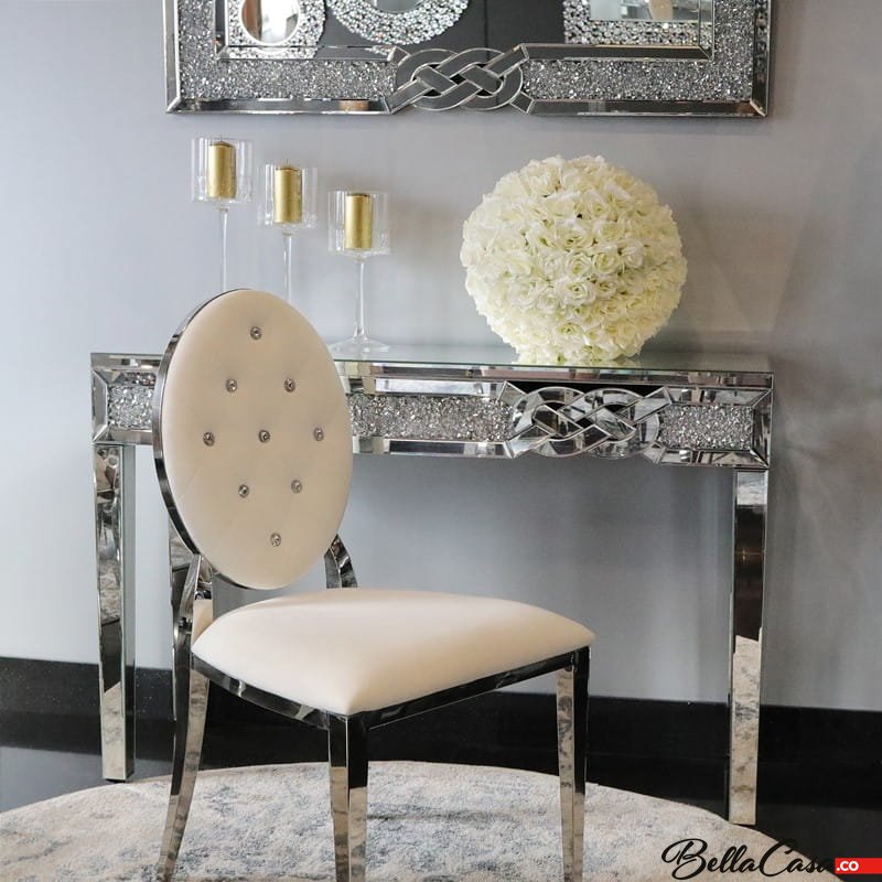 Wykonane ze stali szlachetnej polerowanej, pokryte welurem w kolorze białym (mlecznym), pikowanym kryształkami.