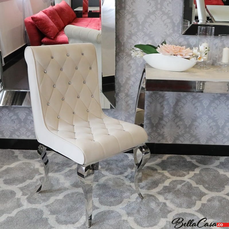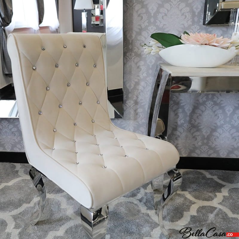Bardzo eleganckie, klasyczne krzesło glamour Hamilton, wykonane ze srebrnej stali szlachetnej polerowanej, pokryte welurem w kolorze beżowym.