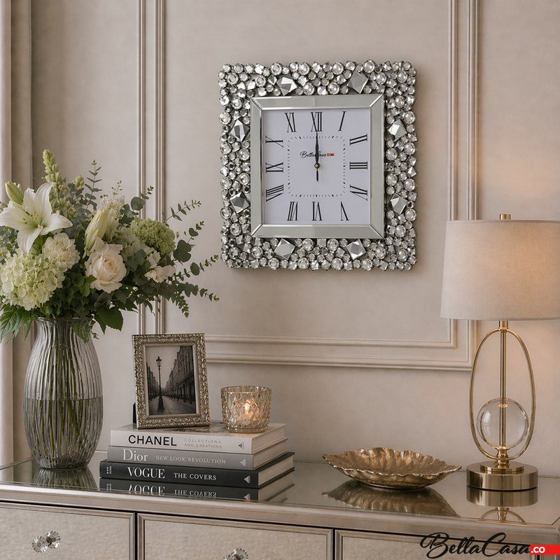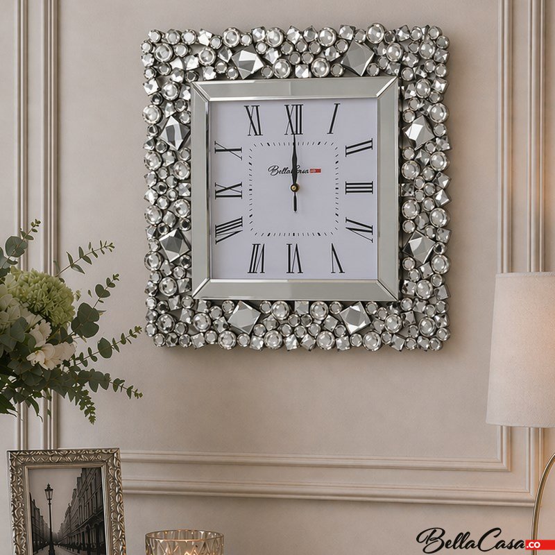 Ozdobny zegar ścienny w kwadratowej, kryształowej ramie.