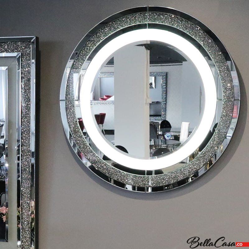 Srebrne lustro glamour okrągłe podświetlane o wymiarach śr.90 cm