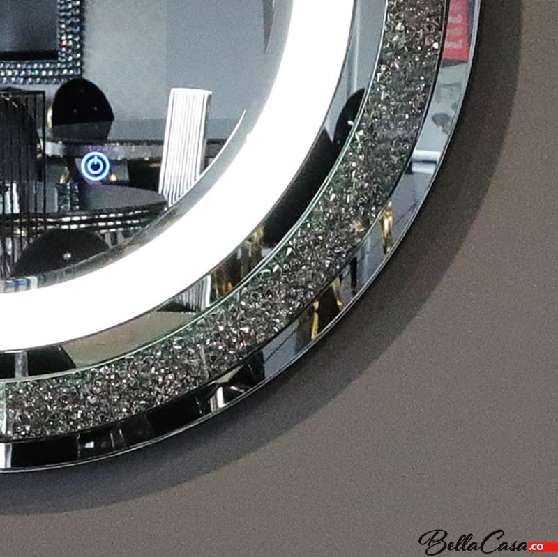 Lustro w stylu nowoczesnym glamour stanowi elegancki dodatek do niemal każdego wnętrza. Doskonale sprawdzi się zarówno w pełnych przepychu, jak i minimalistycznych wnętrzach. Lustro może stanowić wyjątkową dekorację biura, garderoby, czy przymierzalni, jak również ozdobę salonu, jadalni czy przedpokoju. Okrągła tafla otoczona lustrzaną ramką wypełnioną drobnymi ozdobnymi kryształkami z wykończeniem w postaci podświetlenia daje niesamowity efekt całości.
