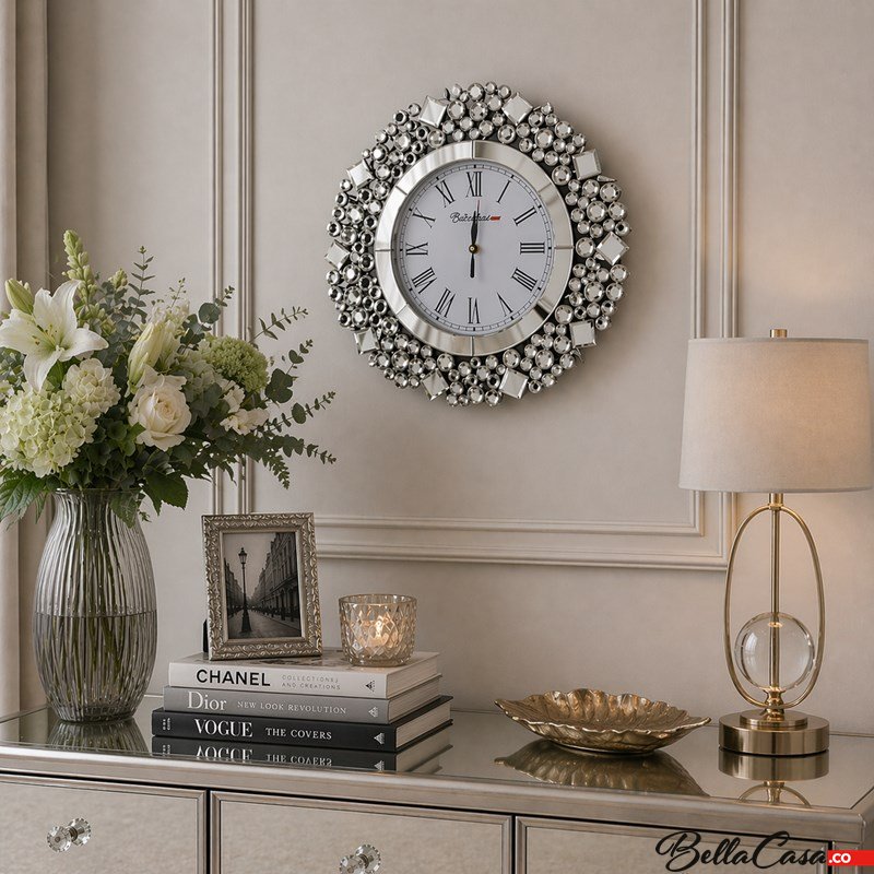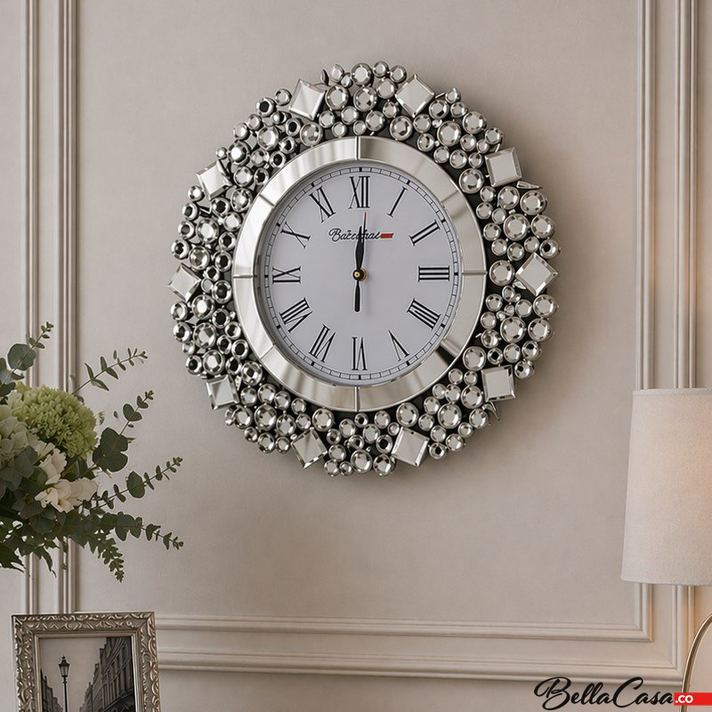 Piękny, okrągły zegar ścienny, którego rama wykonana jest ze szlifowanych, mieniących się kryształków oraz lusterek o różnych formach. Klasyczne białe tło w połączeniu z lustrzanymi detalami doda przestrzeni blasku oraz wytworności, tworząc jednocześnie niesamowity efekt, a oryginalna ażurowa rama zegara pięknie podkreśli charakter wnętrza glamour. Dzięki ozdobnej ramce doskonale sprawdzi się w naszej przestrzeni domowej jak i przestrzeni publicznej: biura, hotelowe lobby czy restauracje.