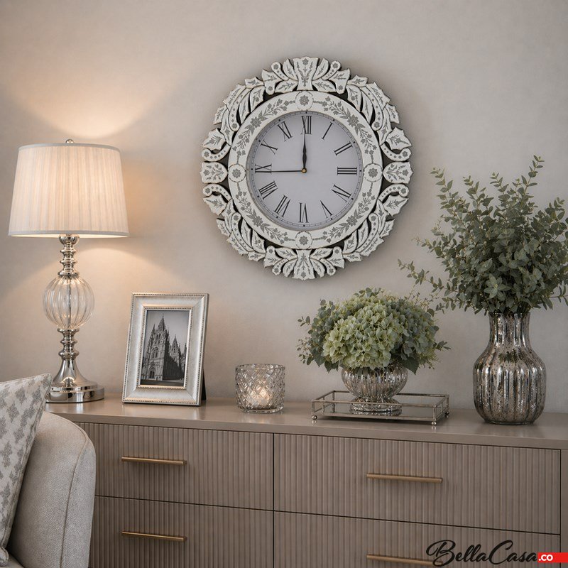 Elegancki zegar ścienny glamour z lustrzaną ramą, doskonała dekoracja do nowoczesnych wnętrz.