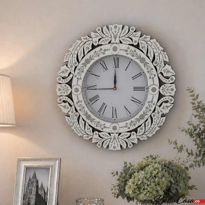 To nowoczesny zegar dekoracyjny, który doskonale wpisuje się w aranżacje w stylu glamour, nowojorskim czy współczesnym. Klasyczne, białe tło w połączeniu z lustrzanymi detalami rozświetla przestrzeń, dodając jej blasku i wytworności.