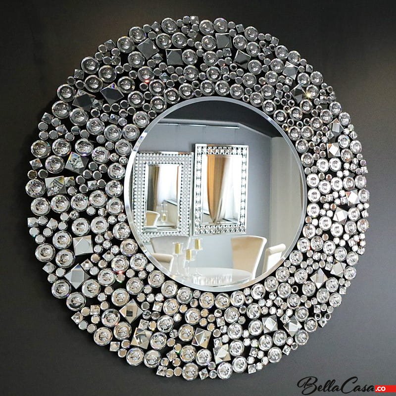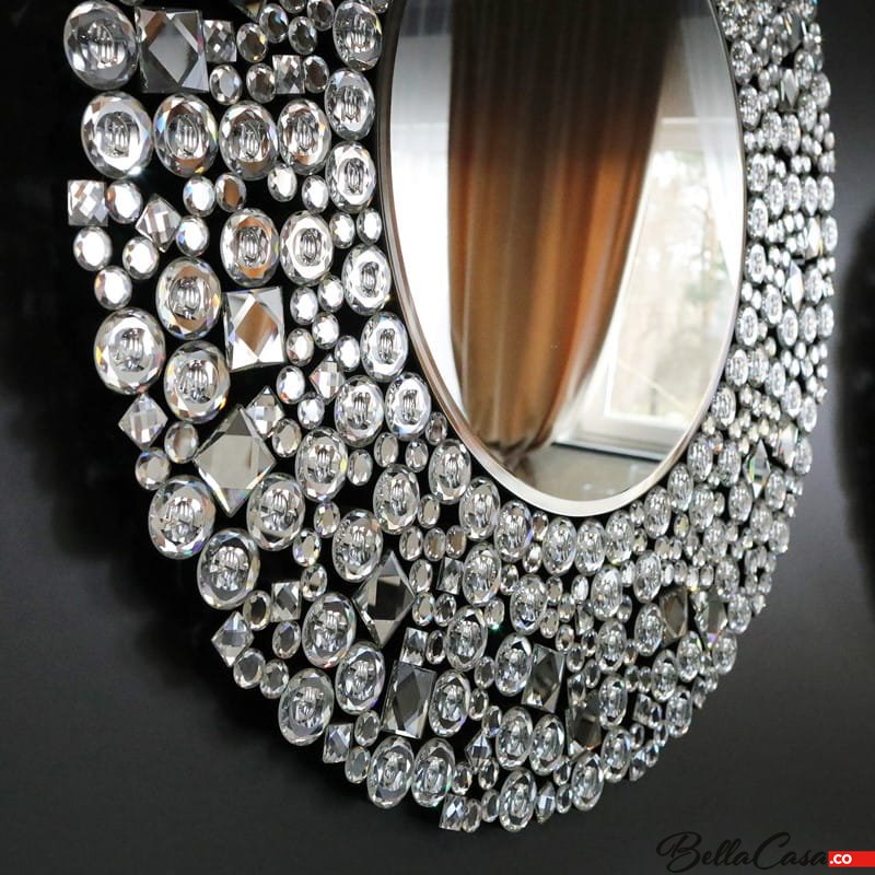 Kryształowe srebrne lustro okrągłe z szeroką ramą, dekorowaną kryształkami. Okrągłe lustro ścienne to idealna propozycja dla osób ceniących sobie połączenie olśniewającego designu z wygodą użytkowania.