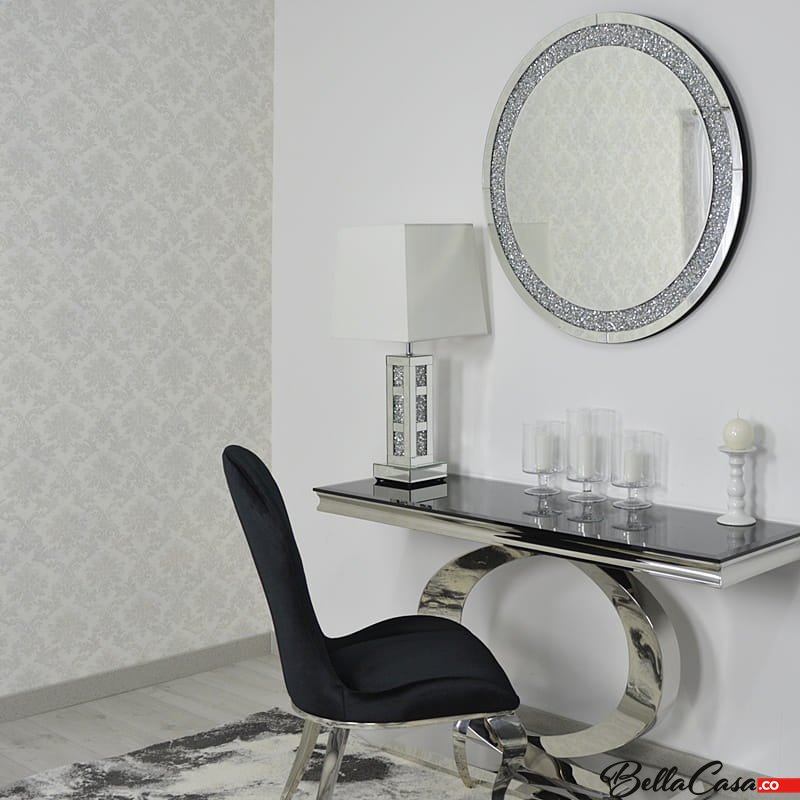 Lustro zachwyca swoją elegancją, jednocześnie nadając niesamowity efekt wizualny, dzięki subtelnej ramie mieniącej się srebrnymi i błyszczącymi kryształkami, rozpraszającymi światło. Dzięki ozdobnej ramie sprawdzi się w każdym nowoczesnym wnętrzu domowym, jak i przestrzeni publicznej: hotelowym lobby, sklepie, restauracji, biurze. Ten model lustra pięknie podkreśli charakter wnętrza glamour dodając blasku i wytworności niejednej aranżacji. Model idealny do wnętrz urządzonych w sylu glamour, nowojorskim oraz nowoczesnym.