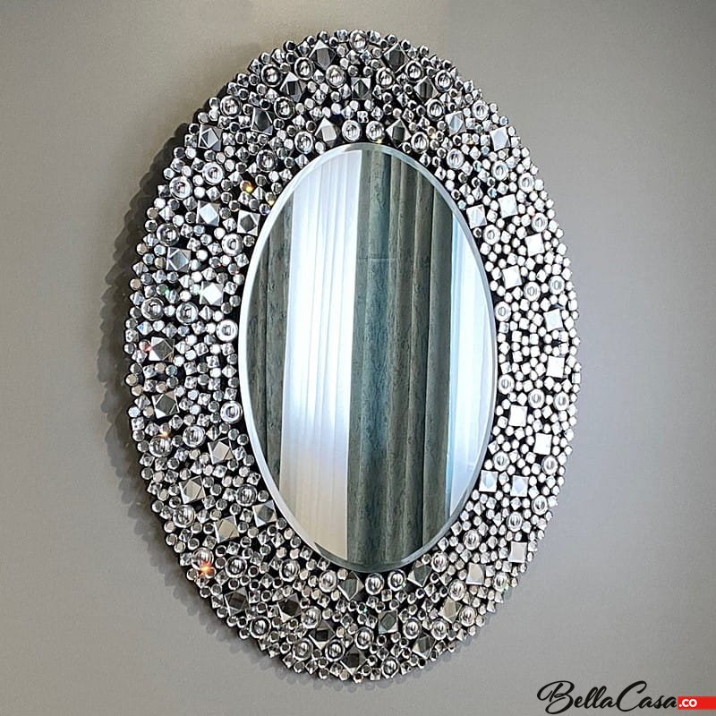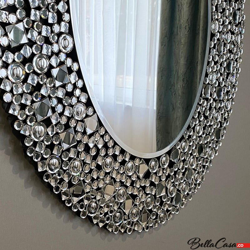 Kryształowe srebrne lustro owalne z szeroką ramą, dekorowaną kryształkami.