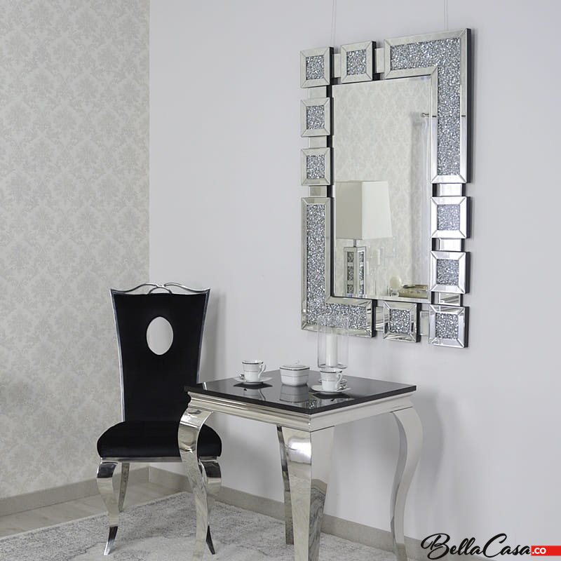 Pełne blasku lustro wiszące w stylu glamour, dekorowane ozdobną, kryształową ramą w której zatopiono drobne kryształki. Lustro pięknie podkreśli charakter wnętrza w stylu glamour dodając blasku i wytworności niejednej aranżacji. Zachwyca swoją elegancją, jednocześnie nadając niesamowity efekt wizualny. Doskonale sprawdzi się w każdym pomieszczeniu domowym jak i przestrzeni publicznej - hotelowe lobby, sklepy, restauracje, biura. Lustro idelane dla miłośników nietuzinkowych przedmiotów. Jednocześnie stanowi doskonały pomysł na prezent.