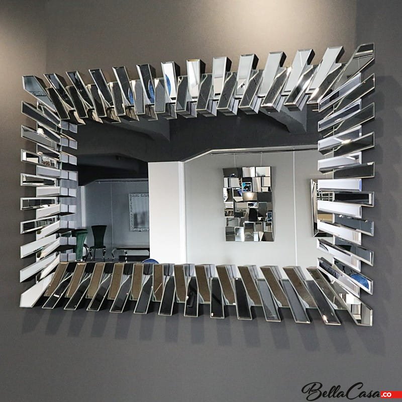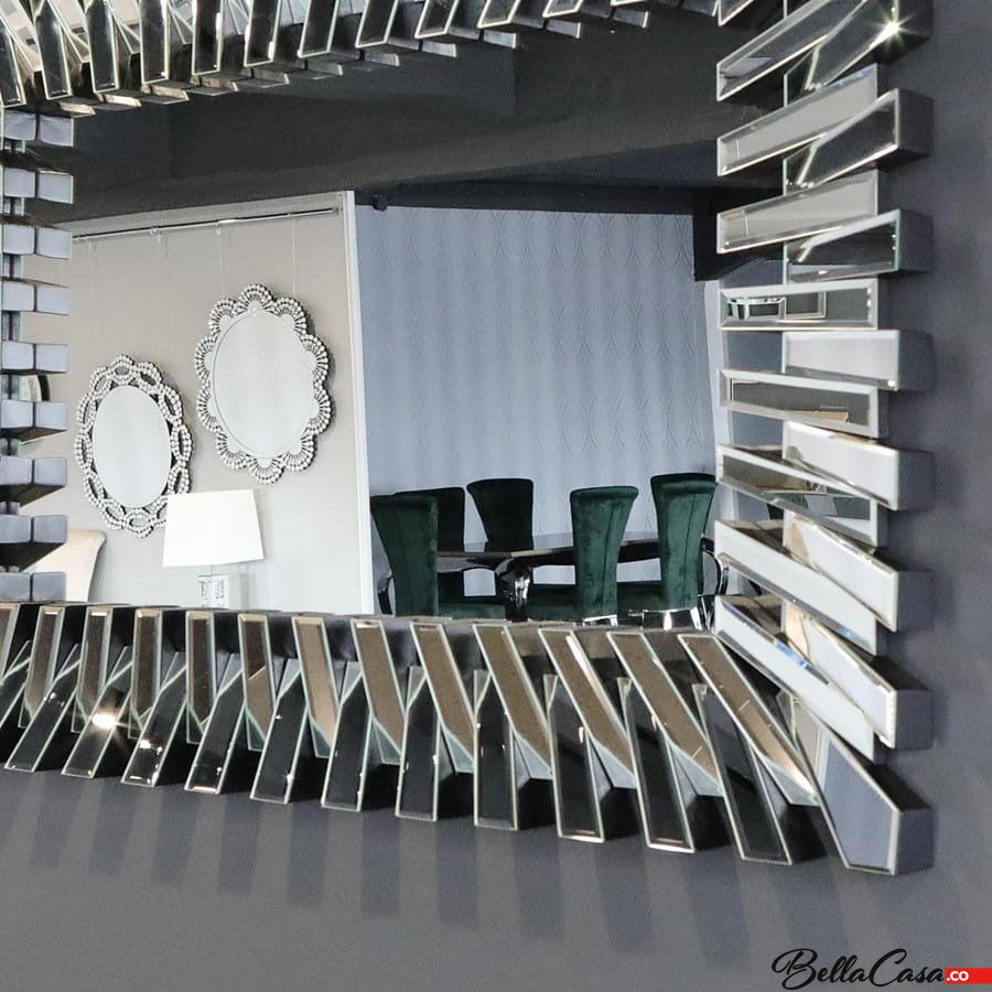 Lustro urzeka nie tylko swoją prostą i gładką powierzchnią, lecz także niezwykle oryginalną ramą składającą się z frezowanych naprzemiennie ułożonych lustrzanych kawałków co sprawia, że rama tworzy niezwykły efekt 3D wnosząc do pomieszczenia pewną finezję. Lustrzana rama rozświetli i optycznie powiększy pomieszczenie pięknie odbijając światło w salonie. Stanowi wspaniały pomysł na dekorację każdej wolnej ściany w naszej przestrzeni domowej. Będzie również znakomitym wyborem w prestiżowych aranżacjach firmowych, takich jak hotele czy restauracje. Lustro idealne dla miłośników niepowtarzalnych przedmiotów, jednocześnie stanowi doskonały pomysł na prezent.