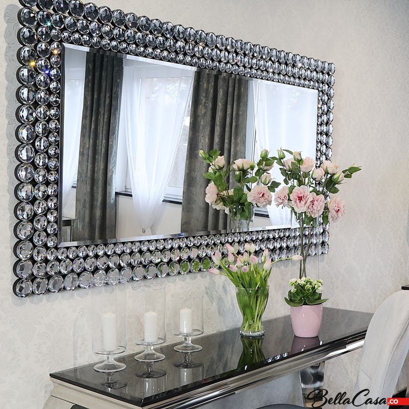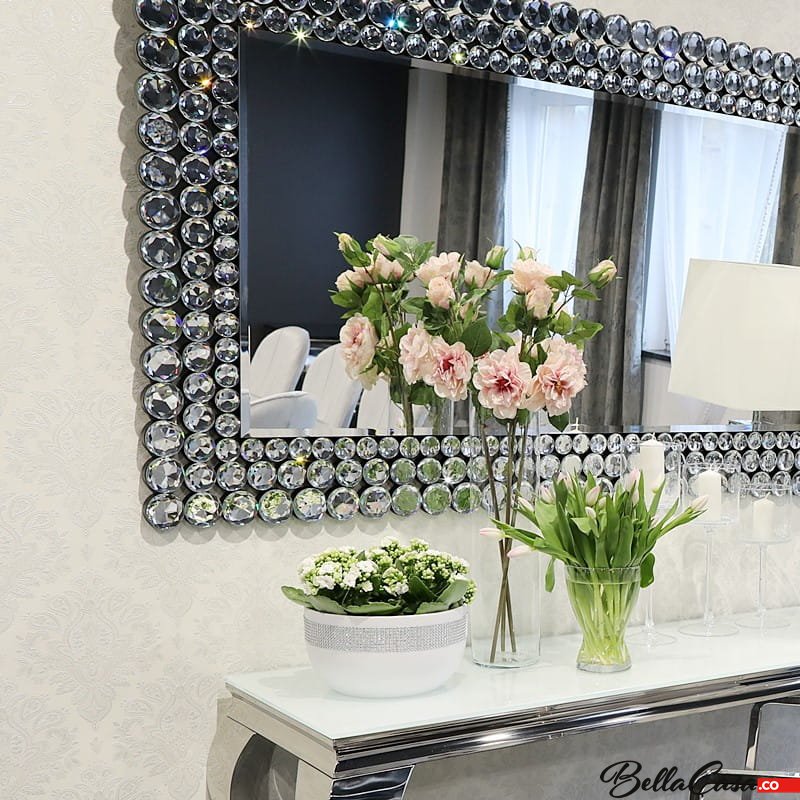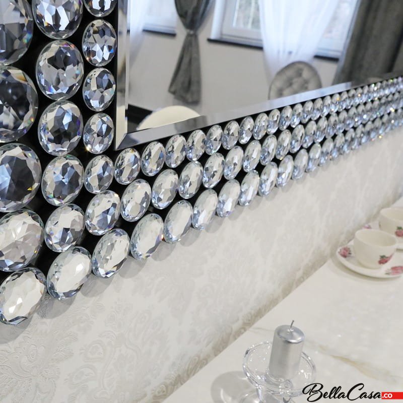 Eleganckie prostokątne lustro dekoracyjne z ozdobną ramą, wykonaną ze szklanych kryształów. Takie dodatki glamour dodają blasku, rozświetlając całe pomieszczenie.