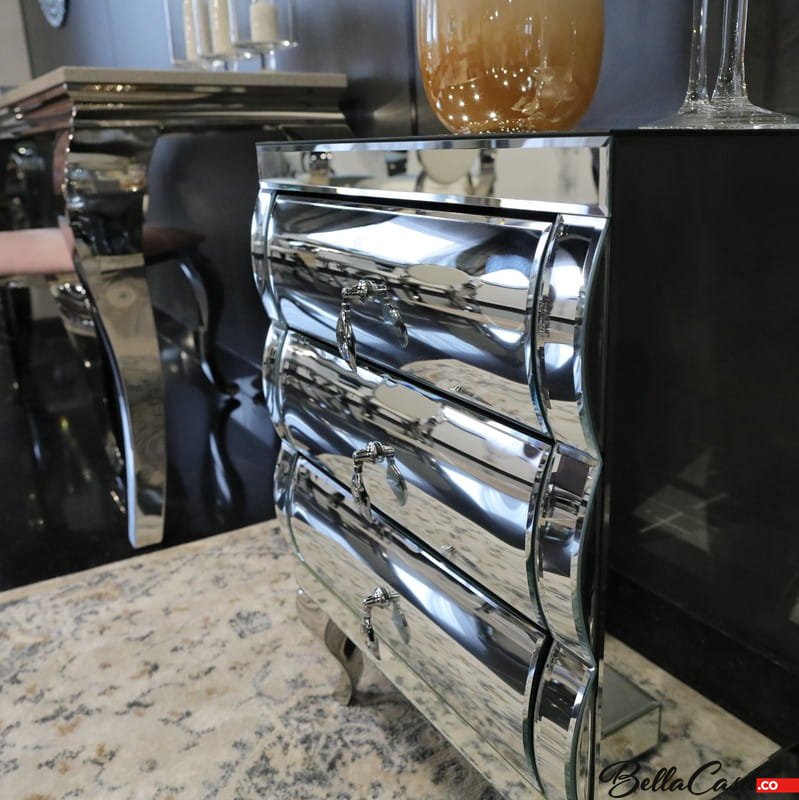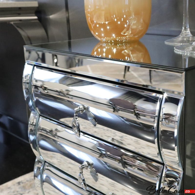 Szklana szafka nocna Milano to mebel, który swoim wyjątkowym designem odmieni każde wnętrze, podkreślając jego wyjątkowy charakter. Sprawdzi się szczególnie jako niesamowicie gustowny, a zarazem bardzo funkcjonalny dodatek do luksusowej sypialni urządzonej w stylu glamour. Szafka nocna Milano to prawdziwa definicja luksusu i elegancji. Mebel ten przyciąga spojrzenia swoim nietuzinkowym wyglądem. Gięte nóżki szafki zostały wykonane z najwyższej jakości stali nierdzewnej polerowanej. Górna część pokryta jest gładkimi taflami szkła lustrzanego, które pięknie połyskują w świetle, tworząc wyjątkowy i niezwykle przytulny klimat. Szafka posiada kilka szuflad z ozdobnymi uchwytami.