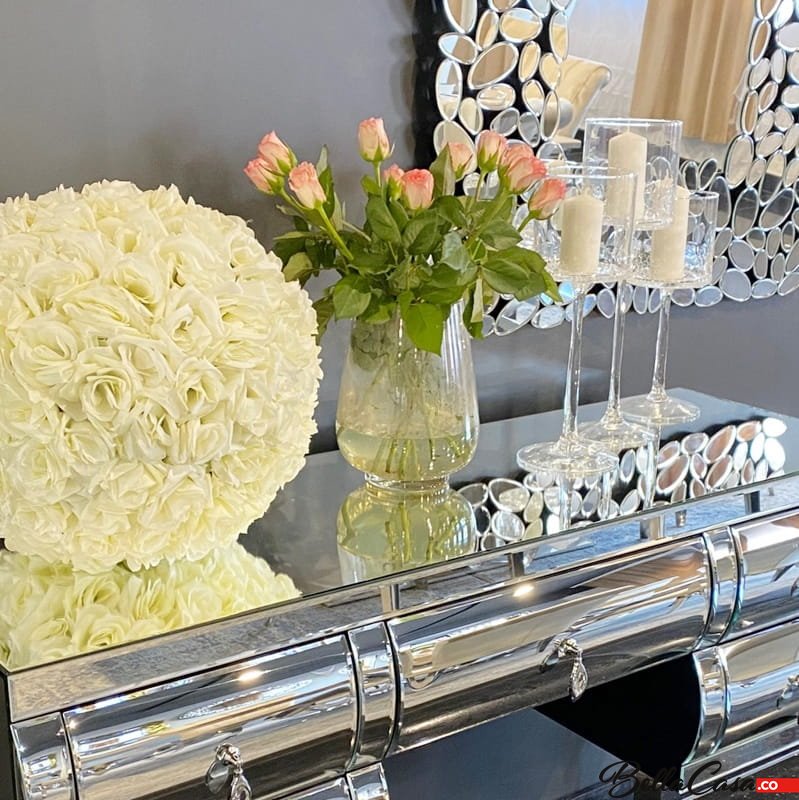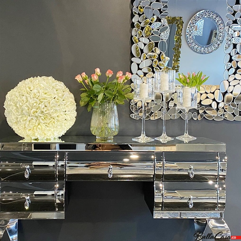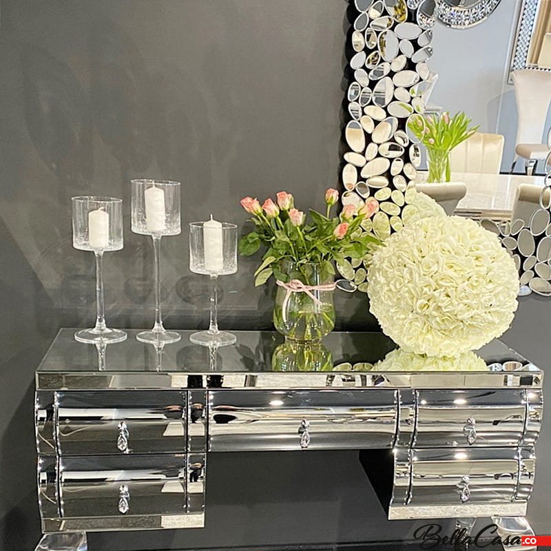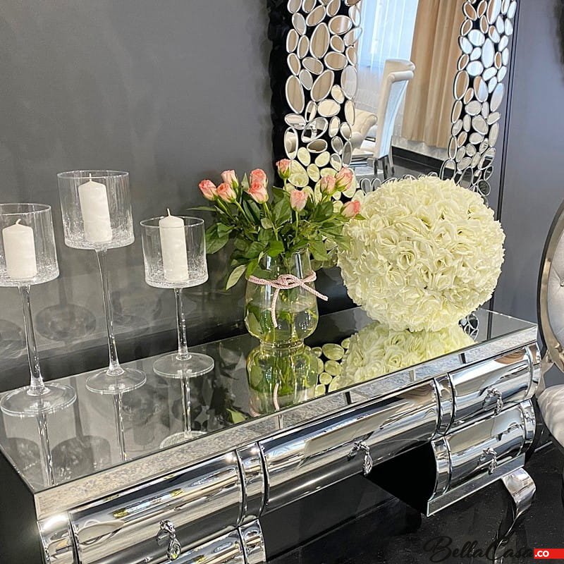 Lustrzana toaletka Milano to mebel, który swoim wyjątkowym designem odmieni każde wnętrze, podkreślając jego wyjątkowy charakter. Sprawdzi się szczególnie jako niesamowicie gustowny, a zarazem bardzo funkcjonalny dodatek do luksusowej sypialni urządzonej w stylu glamour. Toaletka Milano to prawdziwa definicja luksusu i elegancji. Mebel ten przyciąga spojrzenia swoim nietuzinkowym wyglądem. Gięte nóżki toaletki zostały wykonane z najwyższej jakości stali nierdzewnej polerowanej. Górna część toaletki pokryta jest gładkimi taflami szkła lustrzanego, które pięknie połyskują w świetle, tworząc wyjątkowy i niezwykle przytulny klimat. Toaletka posiada kilka szuflad z ozdobnymi kryształowymi uchwytami. Połączenie klasycznego srebra z subtelnie mieniącym się szkłem tworzy zachwycającą całość i gwarantuje olśniewający efekt. Toaletka może spełniać również funkcję konsoli w naszym salonie czy przedpokoju.