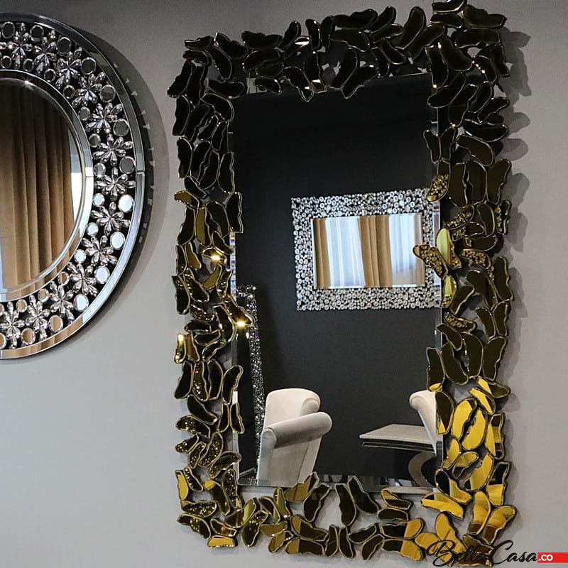Lustro w stylu nowoczesnym glamour stanowi elegancki dodatek do niemal każdego wnętrza. Doskonale sprawdzi się zarówno w pełnych przepychu, jak i minimalistycznych wnętrzach. Lustro może stanowić wyjątkową dekorację biura, garderoby, czy przymierzalni, jak również ozdobę salonu, jadalni czy przedpokoju. Prostokątna tafla otoczona rzędem lustrzanych, asymetrycznych zdobień w złotej kolorystyce daje niesamowity efekt całości.