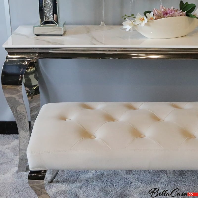 Siedzisko pufy tapicerowane jest miłą w dotyku welwetową tkaniną, a wykonany ze stali slachetnej stelaż zapewni stabilizację i trwałość użytkowania. Dzięki giętym nogom charakteryzowanym na styl ludwikowski, idealnie będzie komponował się z naszymi krzesłami pikowanymi w zestawie ze stołami jadalnianymi a'la Ludwik.