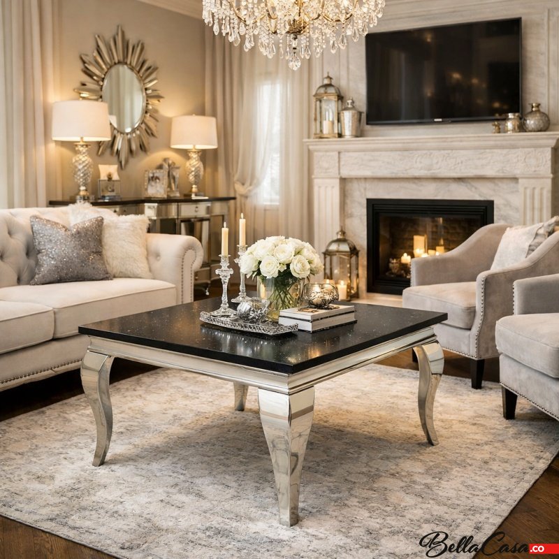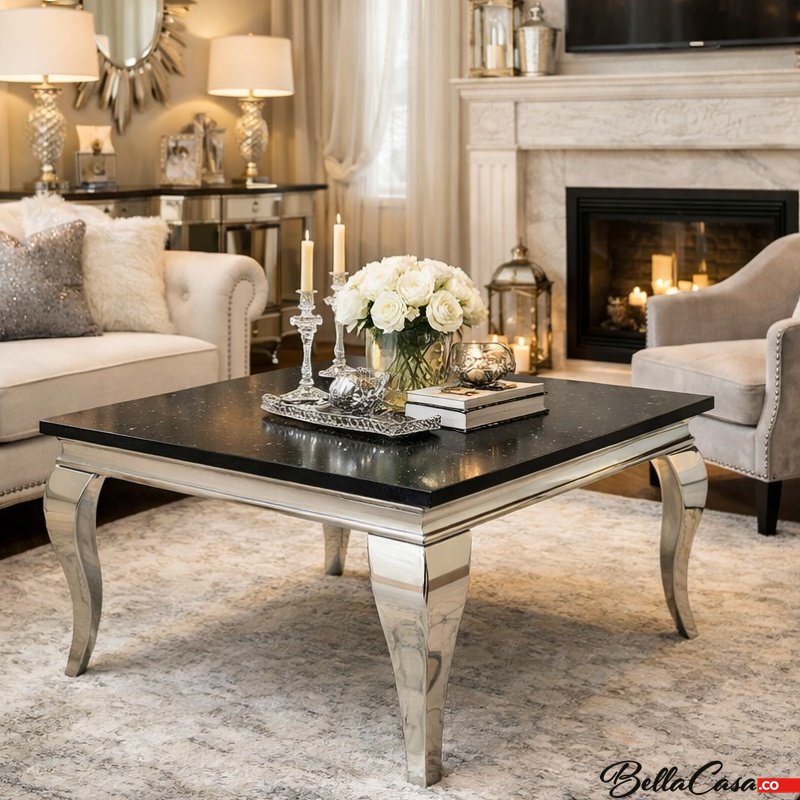 Ludwik glamorous side table, made of polished stainless steel with Starlight Black stone top.