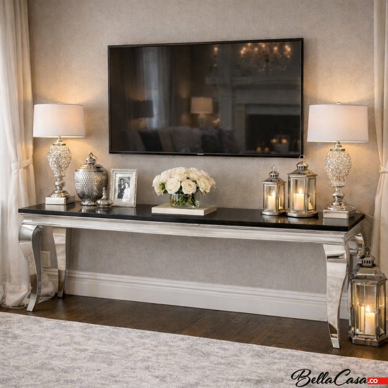 Stolik RTV glamour Ludwik, wykonany ze stali szlachetnej polerowanej w komplecie z blatem kamiennym do wyboru