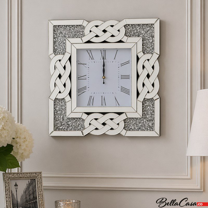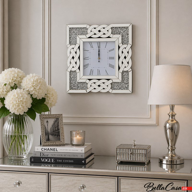 Zegar ścienny glamour z lustrzaną ramą i kryształkami – kwadratowy zegar dekoracyjny