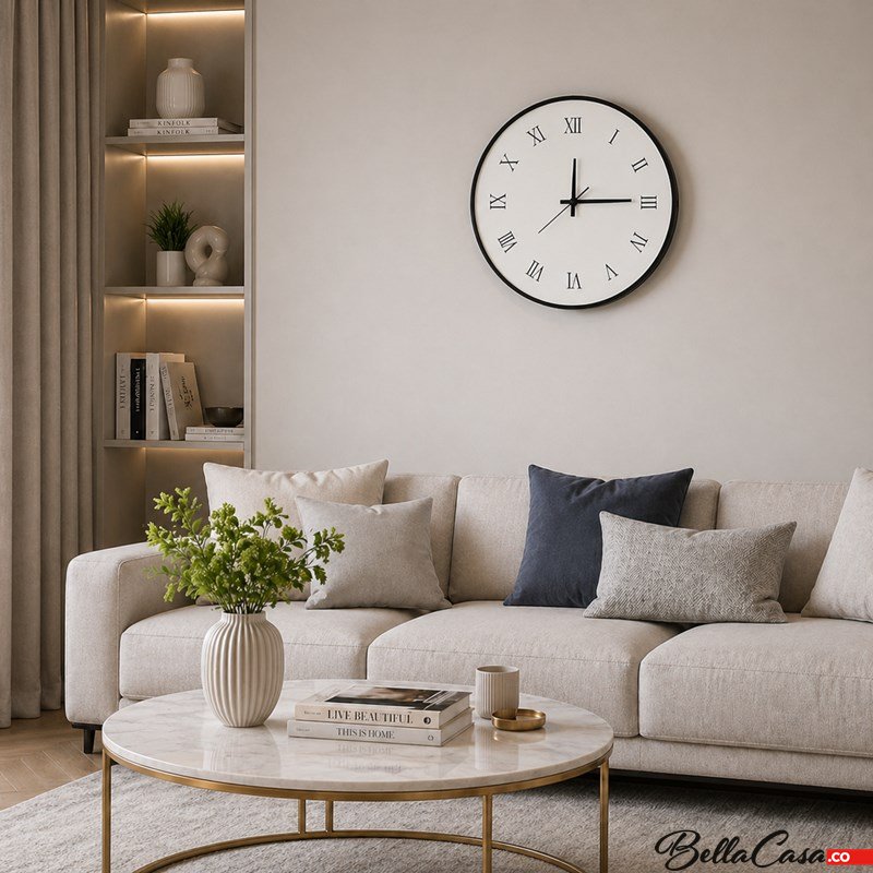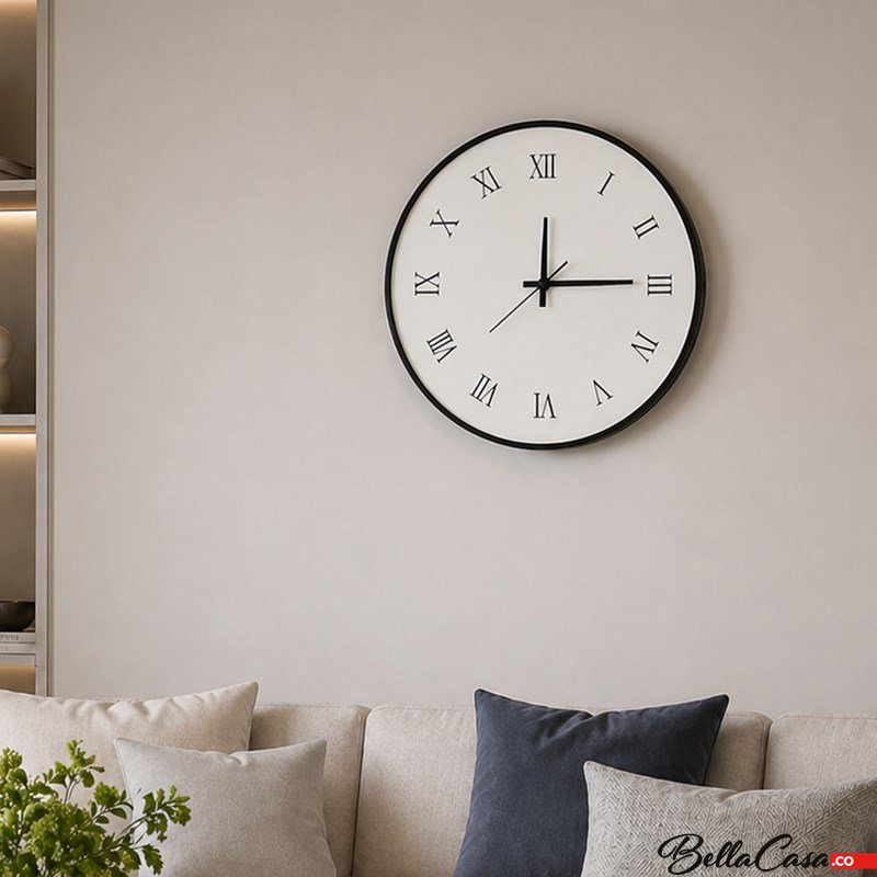 Zegar ścienny nowoczesny czarny z rzymskimi cyframi to elegancka i uniwersalna dekoracja, która doskonale uzupełni aranżację salonu, sypialni, jadalni, biura lub przedpokoju. Okrągła forma, cienka czarna rama oraz jasna tarcza tworzą spójną, minimalistyczną kompozycję, która prezentuje się lekko i stylowo. Subtelne cyfry rzymskie oraz proste wskazówki podkreślają ponadczasowy charakter modelu, dzięki czemu zegar świetnie pasuje do wnętrz nowoczesnych, klasycznych, loftowych i skandynawskich.